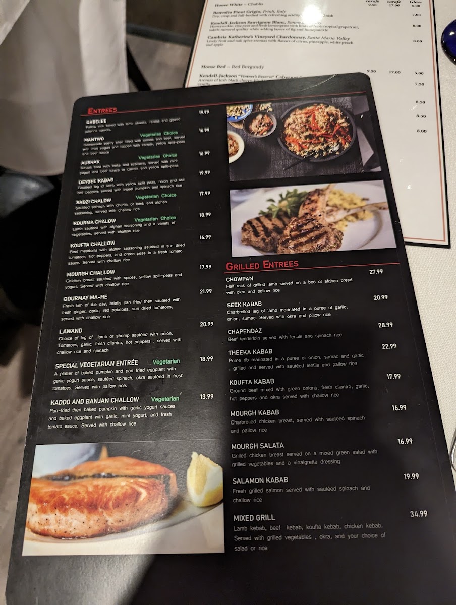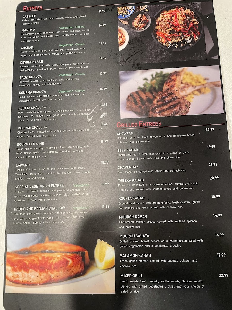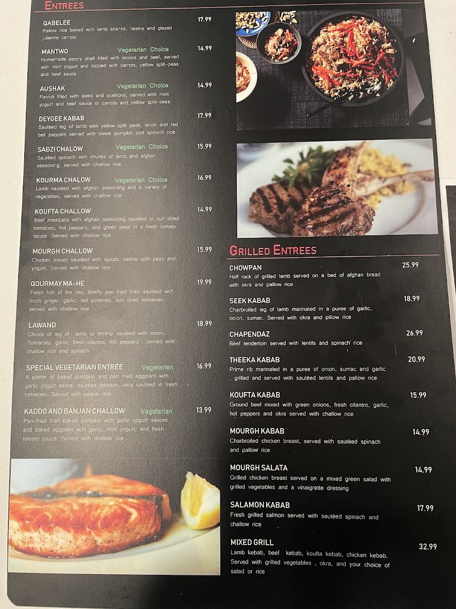 Lamb sautéed with afghan seasonings and a variety of vegetables. Served with challow rice.